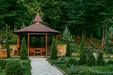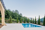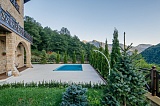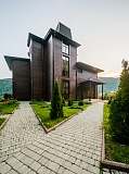 Изысканная архитектура дома уже свидетельствует о его элитарной принадлежности. Первый этаж отделан природным обработанным камнем, а верхние деревом. Гармоничным продолжением архитектурного ансамбля особняка служит красивый ландшафтный дизайн, выполненный в классическом европейском стиле. Площадка перед домом усеяна газонной травой, разбиты красивый цветники, высажены ели, сосны. Также во дворе находится бассейн с чудесным видом на горы, благоустроены зоны для отдыха.