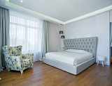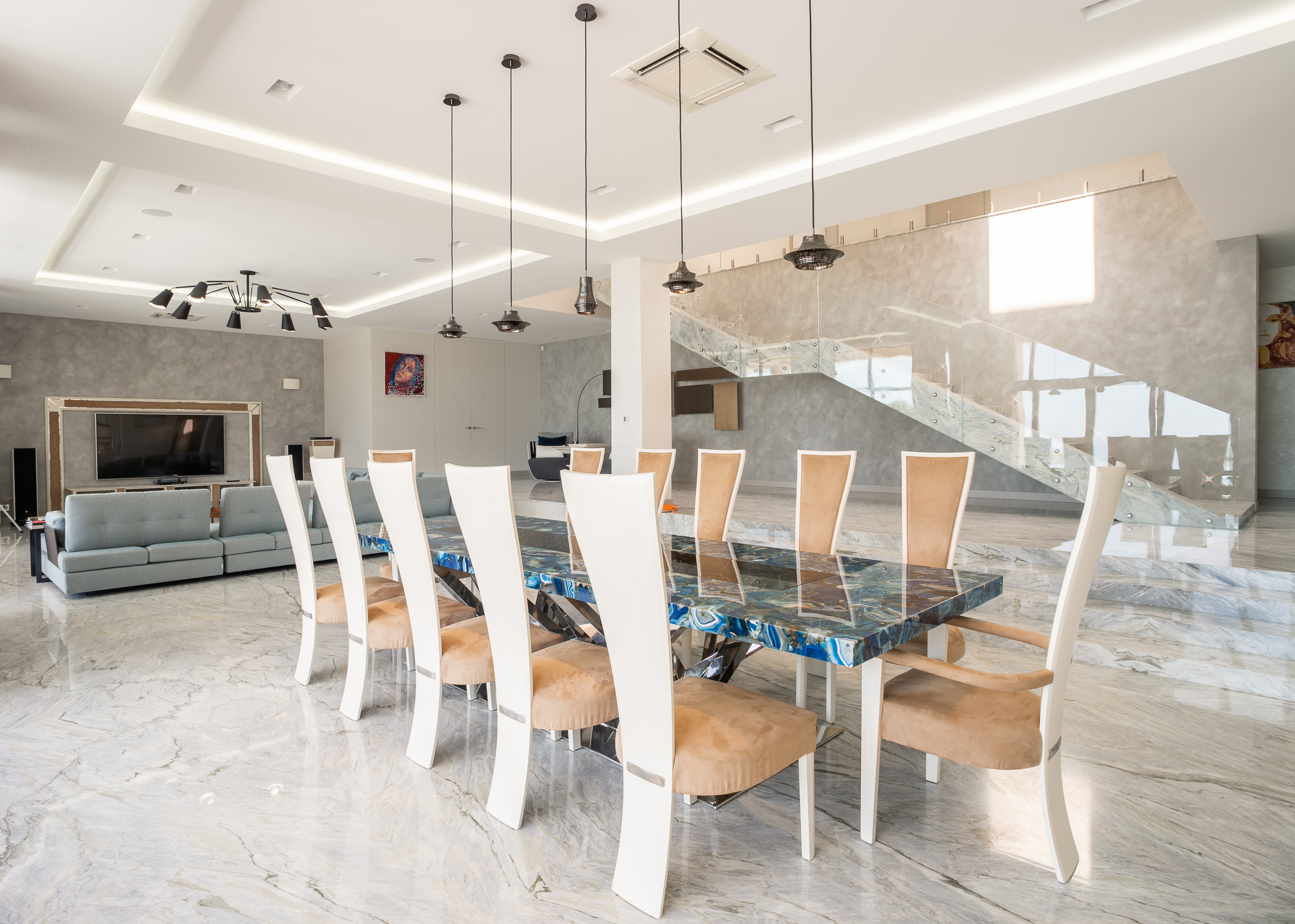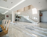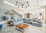 Отделка особняка выполнена с использованием дорогостоящих материалов, что только подчеркивает престижный статус предложения, его предназначение для самой искушенной и требовательной публики. Например, обеденный стол, расположенный в гостиной части квартиры, выполнен из агата с обсидианом, лестница отделана мрамором производства Италии. Усыновлена мягкая мебель от «Swan» и «Vismar», бытовая техника от ведущих мировых брендов.