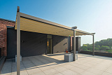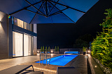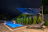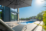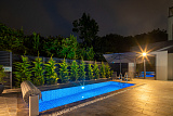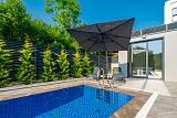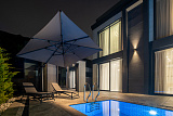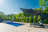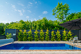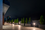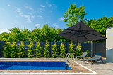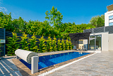 Придомовая территория функционально разделена: обустроен бассейн, зона отдыха, парковка и ландшафтное озеленение. Для комфортного отдыха предусмотрены сауна и эксплуатируемая кровля, где можно организовать lounge-зону для вечернего досуга или уединённых встреч.