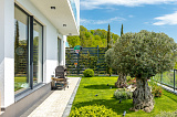 Архитектурное решение коттеджа исполнено в лучших традициях современного хай-тек стиля, который характеризуется простотой геометрии фасадных линий, а также внушительной площадью остекления. Лаконичный и сдержанный ландшафтный дизайн – это прекрасное дополнение к внешней эстетике.