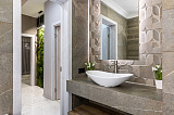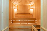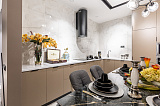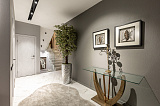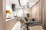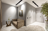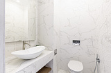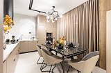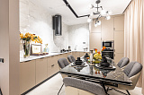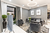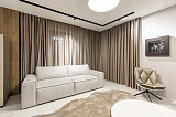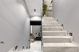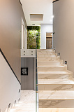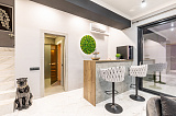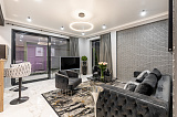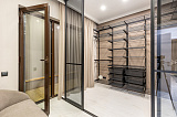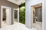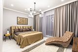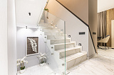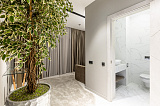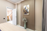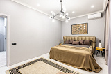 Внутри дома роскошное наполнение. Доступ по биометрическому замку. Огромная прихожая и большой зал с барной стойкой и винным шкафом, сауна с ванной комнатой, оборудованной гидромассажной панелью на первом этаже. Второй этаж представлен просторной кухней с огромным холодильником, большим и малым залами, санузлом, спальней с огромным шкафом-купе, на третьем этаже разместились 3 спальни с панорамными окнами и кондиционерами, шторами блек-аут и тюлем из Италии, большая гардеробная с огромным балконом-подиумом и ванная комната. Мебель Италия и Европа, кухонная техника AEG, японские кондиционеры, высокие матрасы с памятью, дорогие телевизоры, ковры, декор, панно из стабилизированной зелени на первом и третьем этаже.