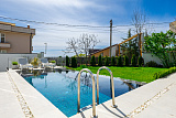Просторный участок площадью 10 соток, помимо указанных строений, включает гараж, просторную парковку, бассейн, зону отдыха и ландшафтный дизайн.