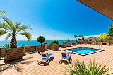 Перед домом располагается зона для отдыха с бассейном и местом для принятия солнечных ванн. Вид отсюда открывается просто потрясающий! Отлично просматриваются морская акватория и южная субтропическая зелень. К слову, ввиду расположения на возвышенной местности, вы можете не переживать о том, что вид кто-то может перекрыть.