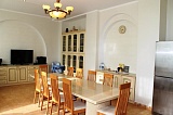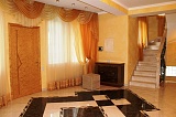 Высота, предлагаемого к продаже коттеджа – 4 этажа. Фасад оформлен декоративной штукатуркой и натуральным камнем, а особую оригинальность внешнему облику дома придают потрясающей красоты кованые ограды балконов. Площадь особняка составляет 460 квадратных метров, внутри выполнен высококачественный ремонт, есть мебель и бытовая техника. Пространство распланировано следующим образом: