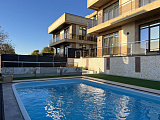 На прилегающем к дому участке – открытый бассейн с системой подогрева, зона для принятия солнечных ванн. Стильный ландшафтный дизайн весьма гармонично подчеркивает эстетичное архитектурное решение дома. Впрочем, это еще один повод для того, чтобы побывать тут и лично оценить все плюсы.