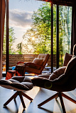Расположенный в окружении лесного массива, дом утопает в природе и наполнен тишиной. С террасы и из окон открываются захватывающие виды на закаты, превращая каждый вечер в особенный момент.