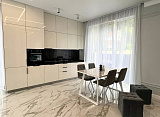 Интерьер оформлен в духе минимализма с использованием высококачественных материалов, что придает ощущение легкости и простора. Большие окна наполняют комнаты естественным светом, а тщательно подобранные предметы мебели и бытовая техника подчеркивают идею умного жилища.