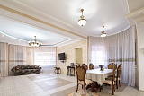 На первом этаже дома расположена большая гостиная комната совмещенная с кухней, спальная комната, санузел.