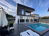 Площадь участка – 6 соток. Перед домом расположился открытый бассейн и оборудованные зоны для принятия солнечных ванн. Выполнен ландшафтный дизайн – высажены кипарисы, пальмы. Ровные участки полностью засеяны газонной травой.