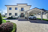 Обогрев осуществляется газовым котлом, предусмотрено водяное отопление пола. Электроснабжение достаточное, возможность подключения дополнительного объема при необходимости. Участок включает в себя площадку для нескольких автомобилей, зону отдыха с террасой и барбекю, а также бассейн. Зеленые насаждения покрывают всю территорию, оснащены автоматической системой полива и ночной подсветкой.