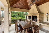 На территории обустроен ландшафтный сад с плодовыми деревьями, летняя кухня, большой бассейн, шезлонги и патио с зоной для барбекю.