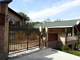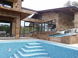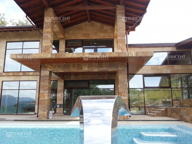 Одним из главнейших достоинств данного предложения смело можно считать оригинальную архитектуру, а также эксклюзивную дорогостоящую отделку, которая способна сразить наповал даже самых искушенных ценителей прекрасного! Фасад дома облицован такими материалами как мрамор, натуральный оникс, травертин и т.д. Особое изящество и некую долю шарма новостройке придают витражные окна, затемненные с внешней стороны. Площадь коттеджа равна 350 квадратным метрам, высота – 2 этажа. На втором этаже есть открытая терраса – патио, а непосредственно перед входом в дом расположился внушительных размеров бассейн с подсветкой и подогревом воды в зимний период времени! Площадь приусадебного участка равна 10 соткам. Немаловажно, что на территории коттеджа также есть двухэтажная пристройка, выполняющая функцию двухместного гаража, расположенного на первом этаже и гостевого дома (второй этаж). Также подчеркнем, что на участке выполнен потрясающей красоты ландшафтный дизайн, пешеходные дорожки вымощены природным камнем, повсюду разбиты цветники и клумбы с экзотическими растениями, цветущими круглый год! Территория дома окружена каменным забором, на калитке установлен домофон и кодовый замок.