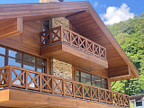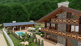 Особняк в стиле шале расположен на участке, площадь которого составляет 16,5 соток. Площадь основного дома для хозяев – 328 м2. В планировке предусмотрена кухня-столовая, гостиная с камином и кабинет на первом этаже. На втором этаже расположены две просторные спальни, каждая с собственной ванной комнатой и балконом. Одна из спален может быть оборудована камином. Мансарда представляет собой свободное пространство, где вы сможете сделать библиотеку, тренажерный зал или, например, бильярдную.