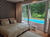 На участке находится бассейн с террасой и зонами отдыха, выйти к которому можно из нескольких комнат. Также этот дом располагает своей собственной баней. Высажено очень много субтропических деревьев, которые подчеркивают уникальность локации – пальмы, ели, олеандры.