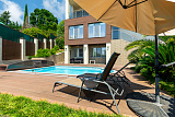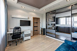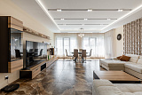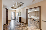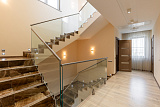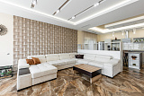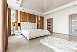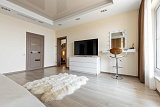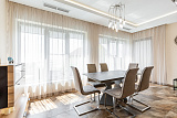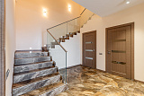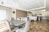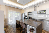 На первом этаже дома расположена гостевая квартира с отдельным входом. Просторная кухня-гостиная оборудована дорогой мебелью и техникой. Само домовладение технически оснащено последними передовыми технологиями: центральная система охлаждения и обогрева, приточно-вытяжная система, теплые полы, датчики температуры, видеонаблюдение и прочее.