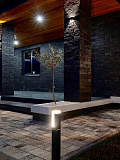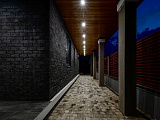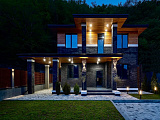 Вечернее освещение акцентирует архитектурные детали, создавая теплую и привлекательную обстановку. А крыша с угловыми наклонами добавляет динамики, в то время как просторные террасы обеспечивают возможность наслаждаться свежим воздухом.
