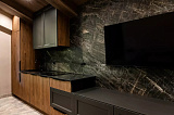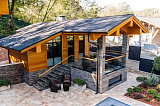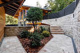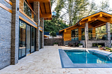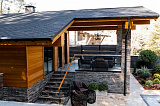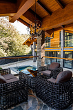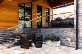 При строительстве использовались окна от ALUMIL и ALUTECH, все выполнено в едином архитектурном стиле шале, применены высококачественные отделочные материалы из натурального камня: мрамор, травертин, доломит. Для облицовки фасада выбран планкен из лиственницы. Уложена мягкая кровля Катера!