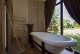 На ухоженной территории размещен живописный сад с богатой коллекцией экзотических растений, просторный бассейн, купель, уютная беседка и зона для приготовления барбекю.