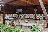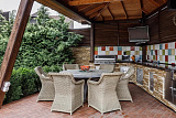 Особое внимание привлекает смелый дизайн: огромные панорамные окна стирают грань между внутренним пространством и прекрасно обустроенным двором с бассейном (12x4 метра). От идеально подстриженного газона взгляд переходит к уютной беседке, летней кухне и зоне SPA, создавая атмосферу безмятежного отдыха.