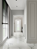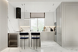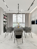 Первый этаж спланирован в просторную опен-спейс зону кухни-гостиной, столовой зоны и кухню, с островом и панорамными окнами. На первом этаже так же имеется гостевой сан узел, кладовая-постирочная и выход на террасу. Отделка полов – итальянский керамогранит, стены – окраска и декоры из молдингов и света. Корпусная мебель и кухня разработаны по индивидуальному заказу.