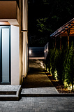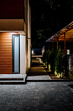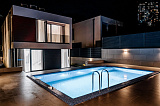 На прилегающей к дому территории выполнен стильный ландшафтный дизайн, который весьма гармонично подчеркивает эстетику архитектурного решения. Есть собственный бассейн и благоустроенные зоны для отдыха, где вы сможете наслаждаться лучами летнего солнца, спокойствием и тишиной. Также во дворе располагается внушительное парковочное пространство, рассчитанное на 4-5 автомобилей.