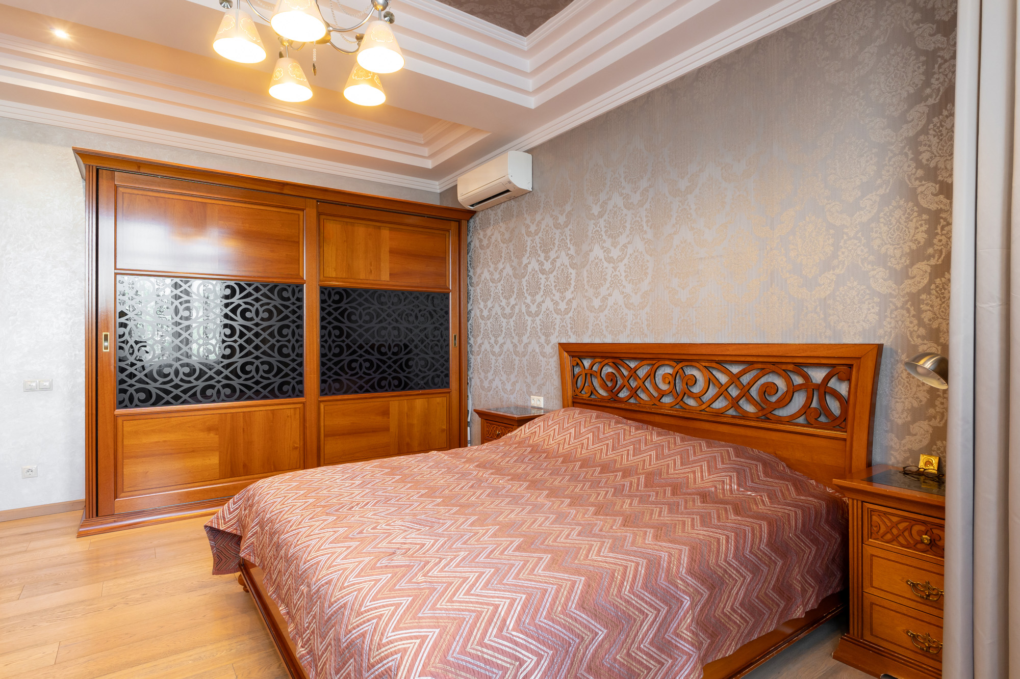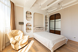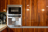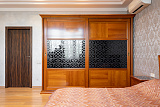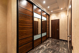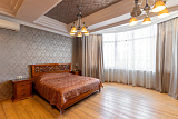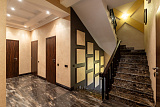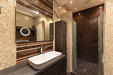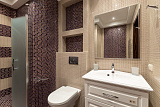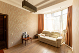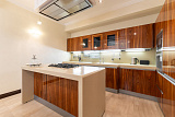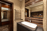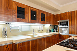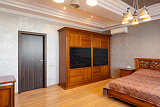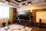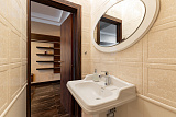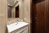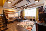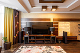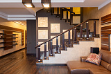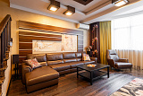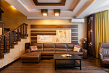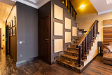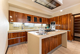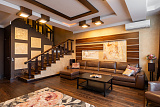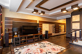 Стильный, современный дом в стиле high-tech. Каждая комната выполнена в лучших традициях данного направления. Прямоугольные силуэты – от подчеркнуто удлиненных до квадратных – придают гостиной выразительность ритмов и математической логики в соразмерности геометрических форм. Эта логика отчетливо прослеживается в общей планировке стен, потолка, в меблировке, в силуэте и конструктивных элементах светильников, лестницы. Достаточно темный тон и активность текстуры шпона крупноформатных мебельных панелей визуально облегчены горизонтальными вставками, взятыми в тон светлой стены. Так же явственно прослеживается текстура и в древесине покрытия пола. Цвет стены решен в светлотном контрасте, а такой фон способен сделать рисунок дерева нарочитым. Для визуального смягчения подобного рода контраста были использованы легкие фактурные разводы, нанесенные на стену несколько более темным тоном. В спальнях применены рисованные обои. В детской это достаточно яркий, насыщенный рисунок, повторяемый мелким модулем, прямоугольного формата. Интенсивность цвета не предполагает больших площадей его использования, поэтому он покрывает только торцевую стену, находящуюся в изголовье кровати. Вся остальная обстановка решена в предельно светлых тонах без выраженного оттенка. Обои другой спальни выбраны с несколько более мелким модулем повторяющегося рисунка, нанесенного сближенным тоном по светло-коричневому фону. Мягкость декора позволила применить его по всей площади стен. Оригинальным решением обращает на себя внимание потолок спальни – три уровня налагающихся друг на друга ниш со скругленными углами создают необычность образа, своеобразие игры света и тени. Стилистическим продолжением дизайна потолка стала ниша стены, объем которой формирует систему прикроватных полок. Дизайн кухни возвращает к прямоугольности форм, которые скруглены только в столешницах. Дерево меблировки имеет ту же степень выраженности текстуры, но предпочтение отдано более насыщенным цветам, придающим большую приподнятость создаваемой здесь атмосферы. Бассейн, ванные комнаты и санузлы отделаны мелкой прямоугольной мозаикой. Декором мозаичного покрытия служат различные сочетания прямолинейных полос разного цвета и тона. На этом этапе проектные разработки перешли в пределы той области, где дизайн интерьера вступает в диалог с дизайном графическим, беря за основу его композиционные ориентиры. От комнаты к комнате варьируются размерное соотношение выкладываемых мозаикой линий, степень цветового и светлотного контрастов, включается фактор материальности и фактуры мозаичного модуля. Через неповторимые комбинации этих сочетаний возникают различные по образному и эмоциональному звучанию интерьеры, в дизайне которых ясно прослеживается как общий принцип стилистической организации, так и оригинальный стиль каждой из комнат. Новые материалы и технологии формирования предметной среды создают для этого благоприятные предпосылки, они открываю творческий простор для дизайн-проектов, которые не облекают интерьер в декоративные одежды из другого времени, а проявляют эстетические достоинства высокого качества современного производства.