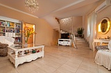- просторная кухня, которая сочетается с гостиной и оформлена шикарным кухонным гарнитуром и элегантной мебелью для обедов и чаепитий;