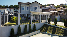 Стильная резиденция в полутора километрах от моря. Участок 14 соток, есть бассейн, территория поселка является закрытой и охраняется.